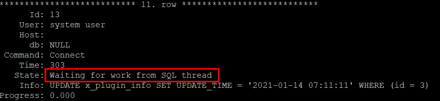 해당 쓰레드의 상태는 여러가지가 있다. (참고) Wating for work from SQL thread는 남아 있는 DB 반영 작업(쿼리)을 기다리는 상태이다.